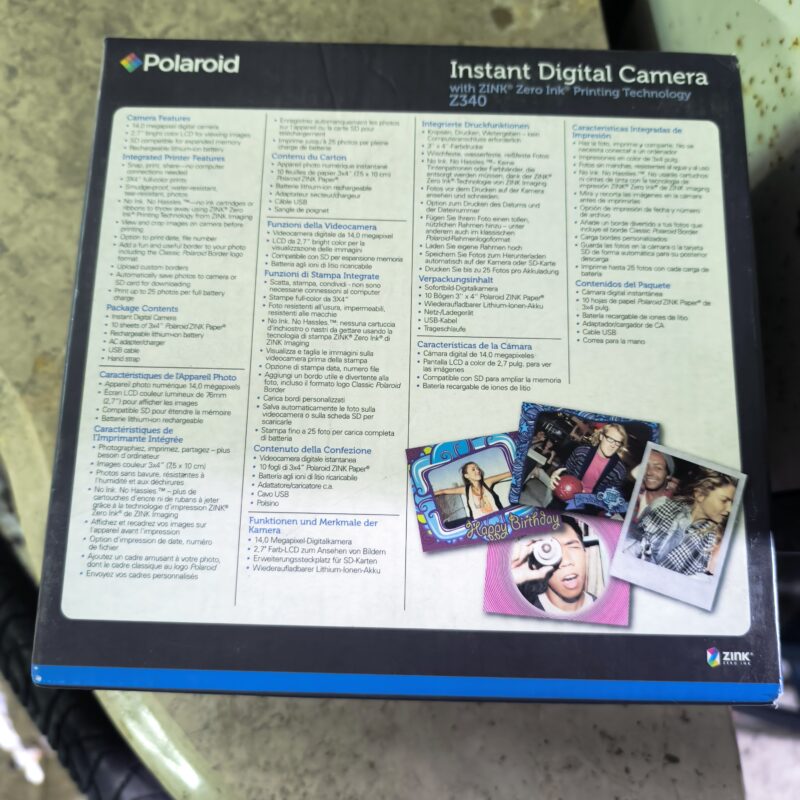 A Polaroid Z340 é uma máquina fotográfica digital compacta com impressão instantânea da imagem. Este aparelho utiliza cartões SD para gravar e está equipado com um sensor de 14 megapixeis e um ecrã LCD de 2,7 polegadas para controlar a imagem. A Z340 imprime imagens de 3 x 4 polegadas, ou seja, 7,62 x 10,1 cm, em papel resistente à água, vendido opcionalmente. A impressão dura menos de um minuto com a Z340. A sua autonomia permite imprimir cerca de 25 imagens.
